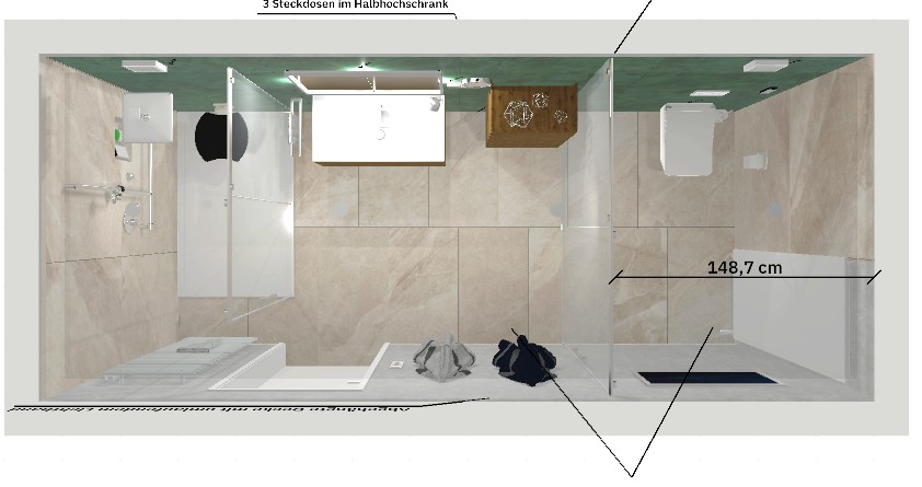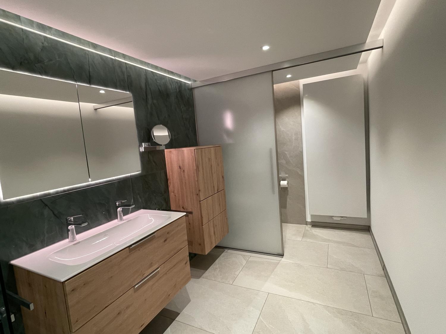 Bei der Bemusterung legten wir zusammen mit den Bauherren Wert auf helle, pflegeleichte Materialien. Besonders ins Auge fällt die jadegrüne Wandfliese an der Waschtischwand – sie setzt einen frischen Akzent und bildet einen schönen Kontrast zur sandsteinfarbenen Grundfliese. Der Waschtisch mit Unterschrank und passendem Hängeschrank in Holzoptik bringt Wärme und natürliche Eleganz in den Raum.
