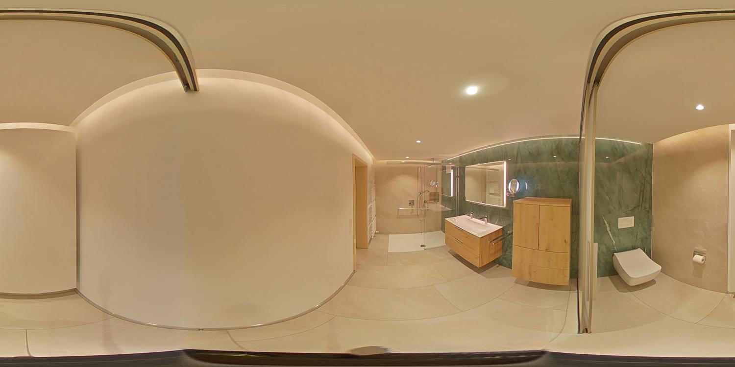 In der großzügigen Dusche wurden eine aus der Decke kommende Regenkopfbrause, eine stabile Haltestange als Handbrausehalter sowie eine elegante Glasschiebetür verbaut. Das separate Washlet (Dusch-WC) ist durch eine raumhohe, blickdichte Glasschiebetür abgetrennt und bietet dezenten Komfort und Intimsphäre.
